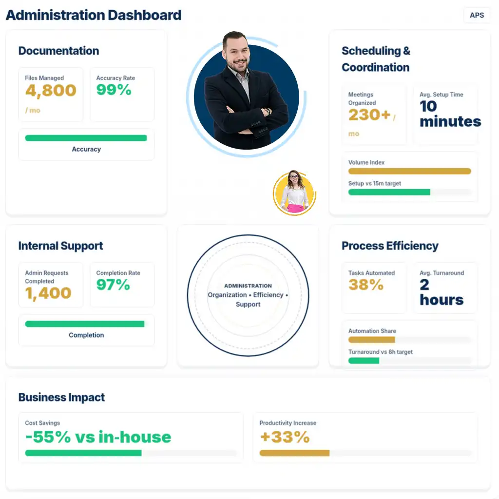 APS gives you skilled administrative assistants who integrate into your workflows, keep schedules on track, manage communications, and handle operational details. With APS, you gain the freedom to focus on growth and big-picture priorities.