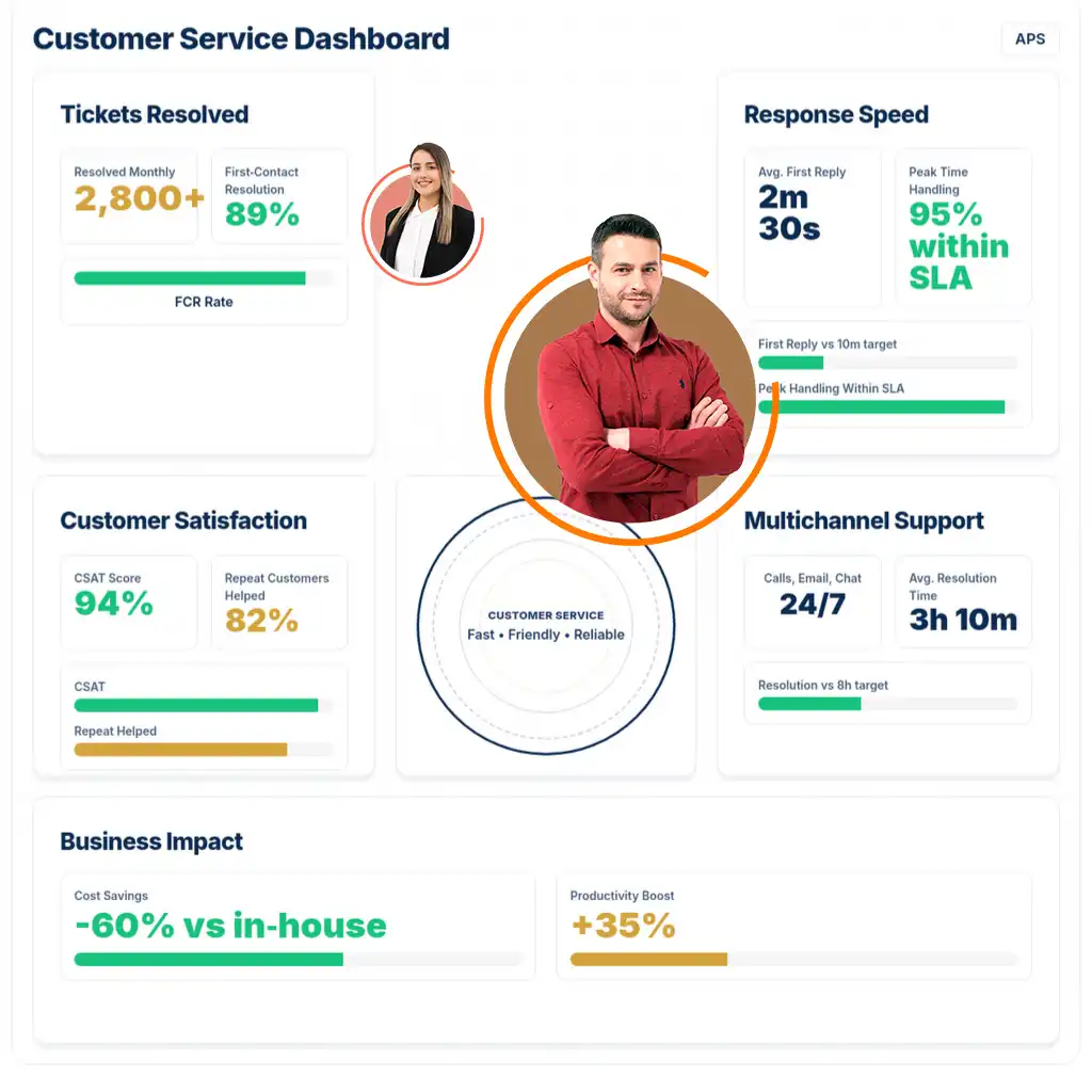 APS offers full-time customer service teams that integrate seamlessly with your workflows. From CRM management to ticketing and live chat, our professionals deliver prompt and reliable support that keeps your customers satisfied.