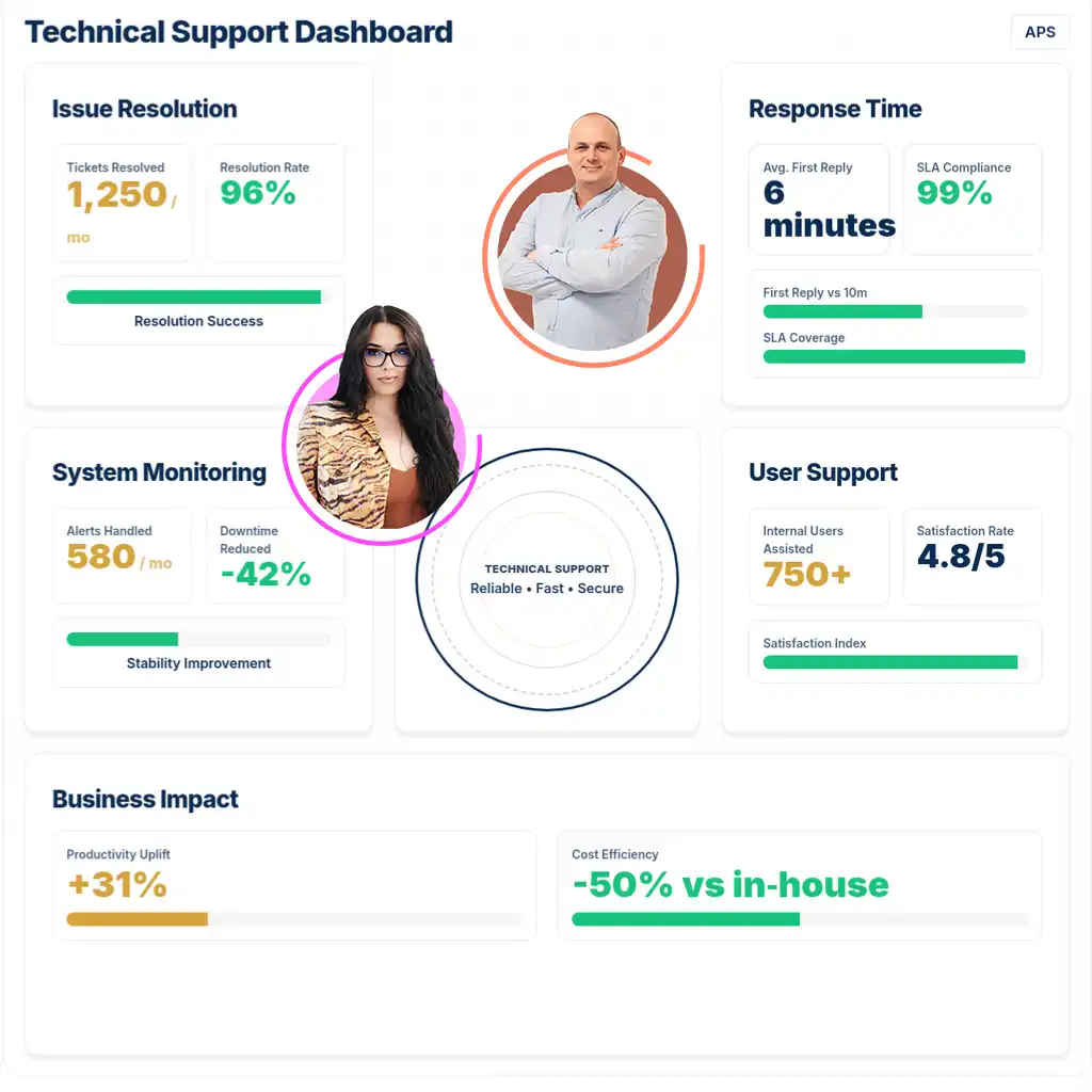 APS connects U.S. businesses with European technical support teams who monitor, maintain, and optimize systems to keep operations running smoothly and without interruptions.