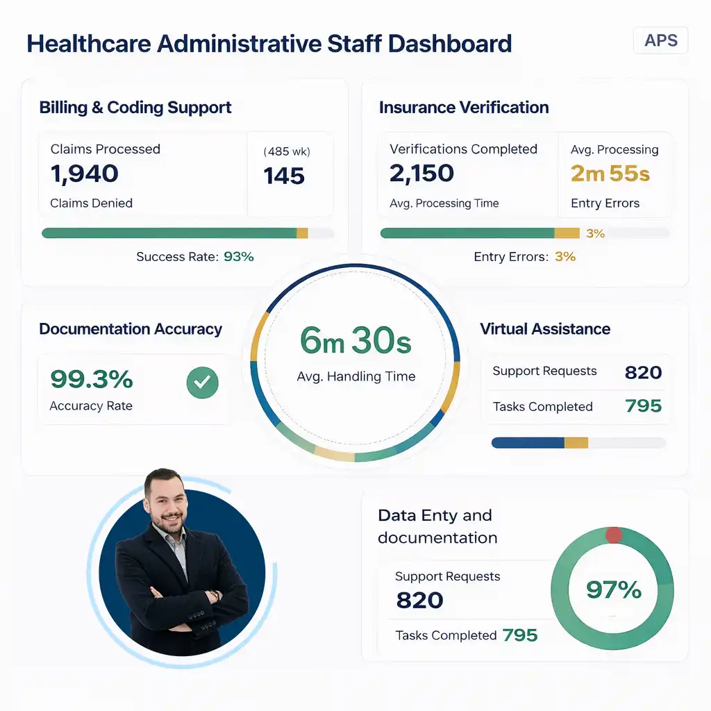 We provide dedicated Healthcare Administrative Staff who manage your healthcare back-office tasks with accuracy, speed, and HIPAA-aware workflows. Working in your time zone and guided by APS management, they integrate seamlessly into your operations.