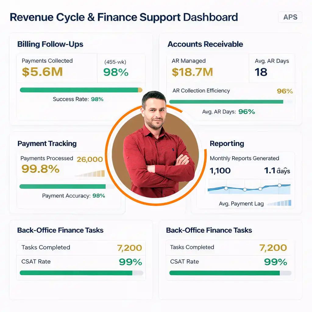 With APS, you gain offshore Revenue Cycle & Finance Specialists who accelerate collections, reduce backlogs, and strengthen your financial operations without increasing overhead.