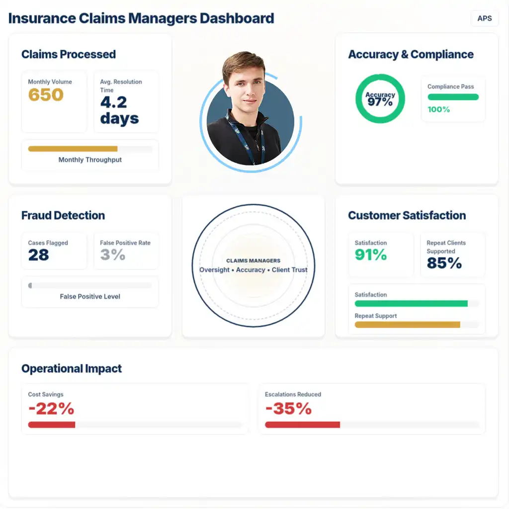 APS offers trained Claims Management Specialists who work in your time zone, speak fluent English, and are guided by our Head of Insurance. They ensure compliance, accuracy, and speed in every claim while reducing costs.